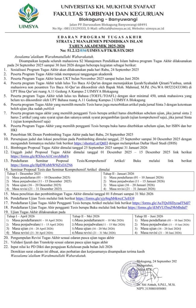 Disampaikan kepada seluruh mahasiswa S2 Manajemen Pendidikan Islam bahwa program Tugas Akhir dilaksanakan pada 24 September 2025 sampai 30 Juni 2026 dengan beberapa kegiatan sebagai berikut: