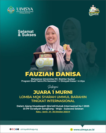 Dalam kompetisi ini, Fauziah Danisa, mahasiswi Program Studi Tadris Ilmu Pengetahuan Alam (TIPA) Fakultas Tarbiyah dan Keguruan UIMSYA semester 1, berhasil meraih Juara 1 Murni pada Cabang Lomba MQK Syarah Ummul Barahin Tingkat Internasional. Keberhasilan Fauziah menjadi kebanggaan besar, mengingat ia masih duduk di semester awal perkuliahan namun telah menunjukkan kapasitas keilmuan yang luar biasa di tingkat global.