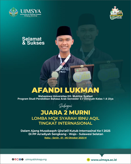 Sementara itu, Afandi Luqman, mahasiswa Program Studi Pendidikan Bahasa Arab Fakultas Tarbiyah dan Keguruan UIMSYA semester 3, juga mencatatkan prestasi gemilang dengan berhasil meraih Juara 2 Murni pada Cabang Lomba MQK Syarah Ibn ‘Aqil Tingkat Internasional. Cabang lomba ini dikenal sangat kompetitif karena menuntut penguasaan mendalam terhadap kaidah nahwu, balaghah, dan analisis linguistik dalam konteks keilmuan Islam.